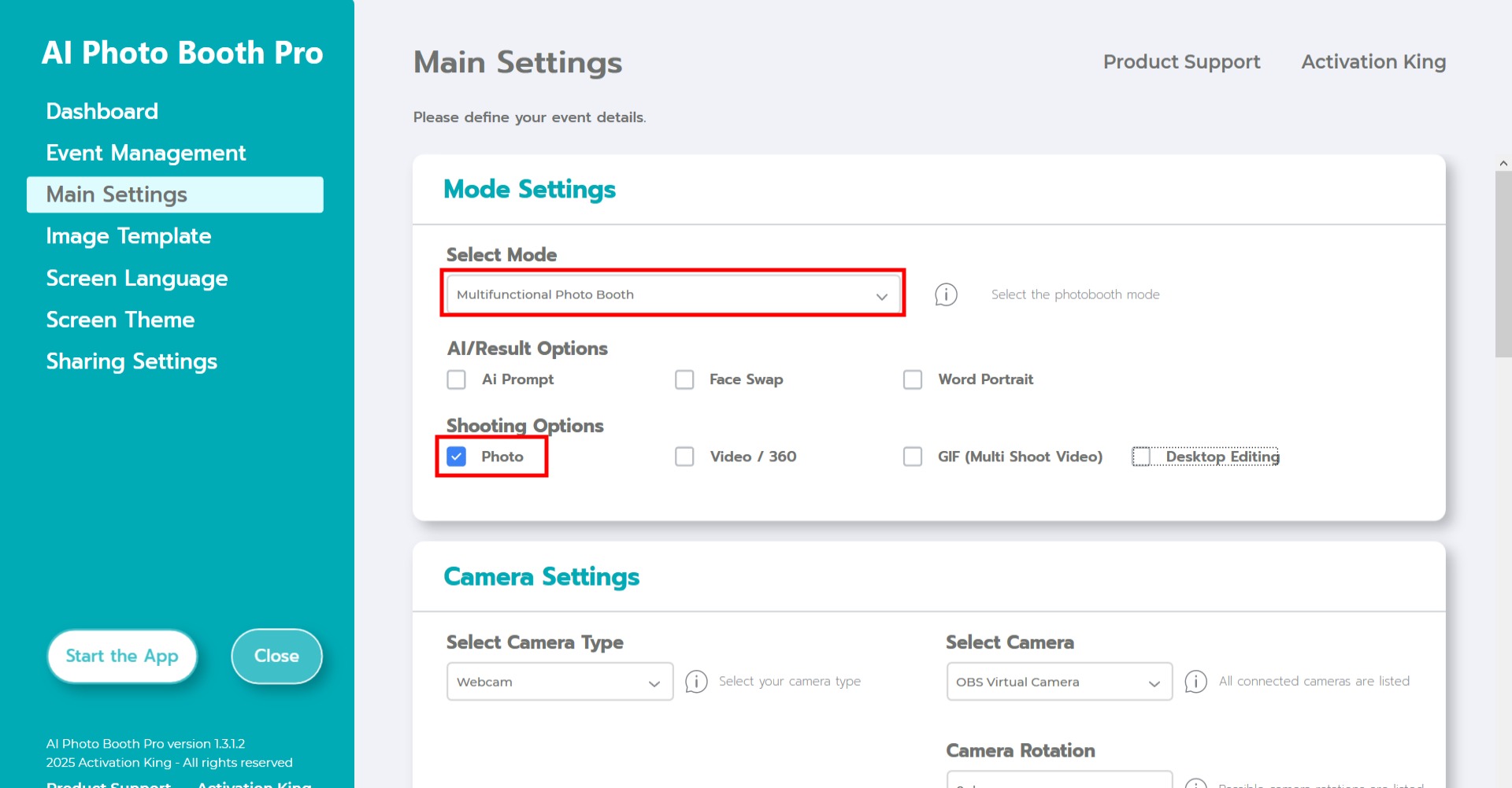 In the “Camera Settings” section, choose the camera type you want to use from the “Select Camera Type” dropdown.