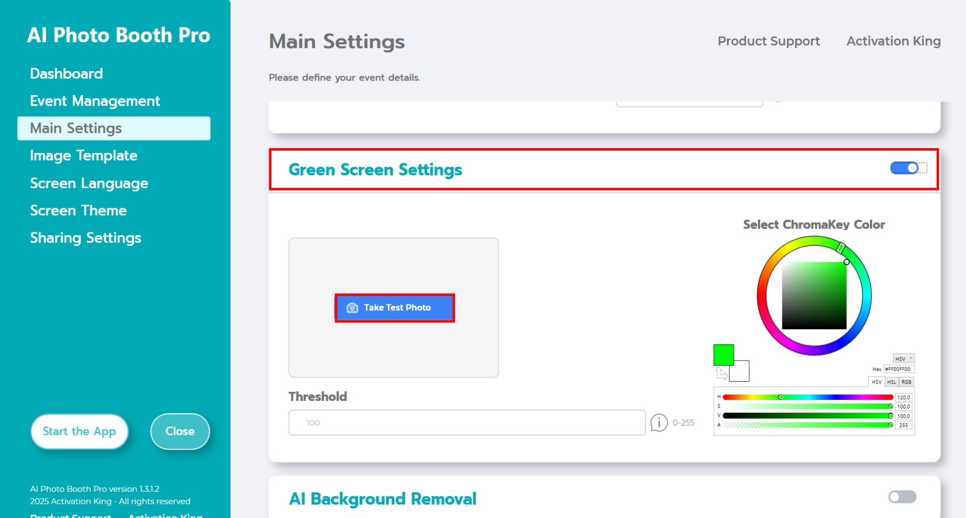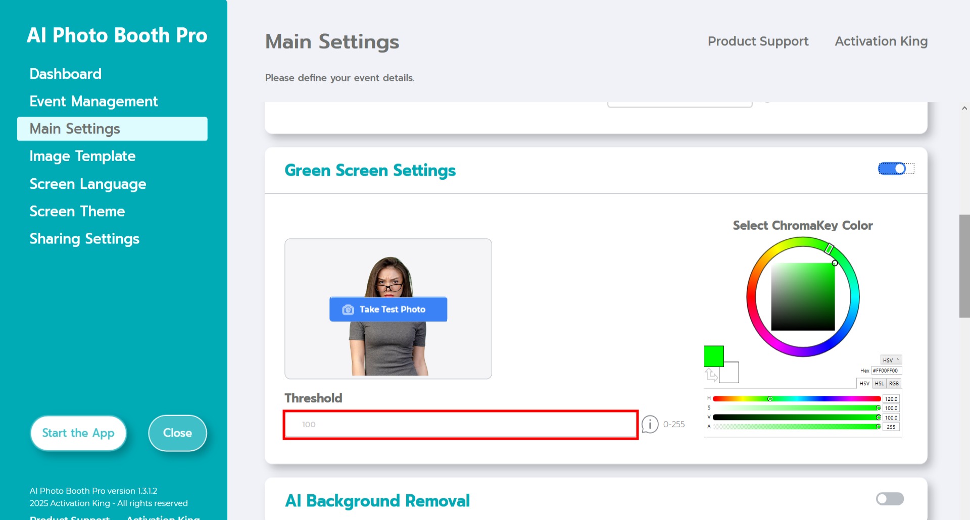 After enabling the “Green Screen Settings” checkbox, additional options for background removal will appear.
