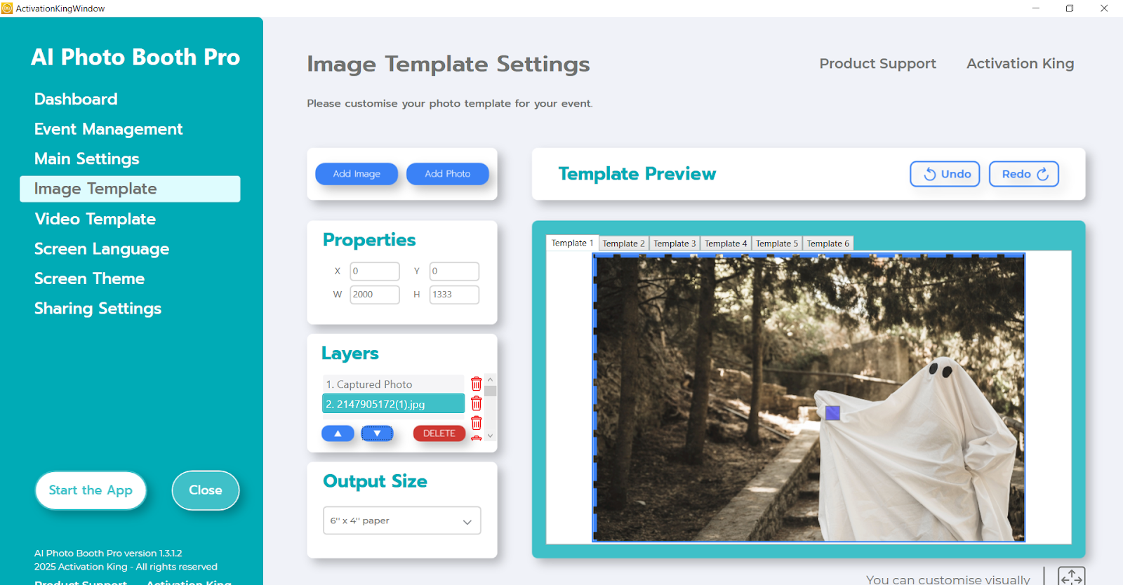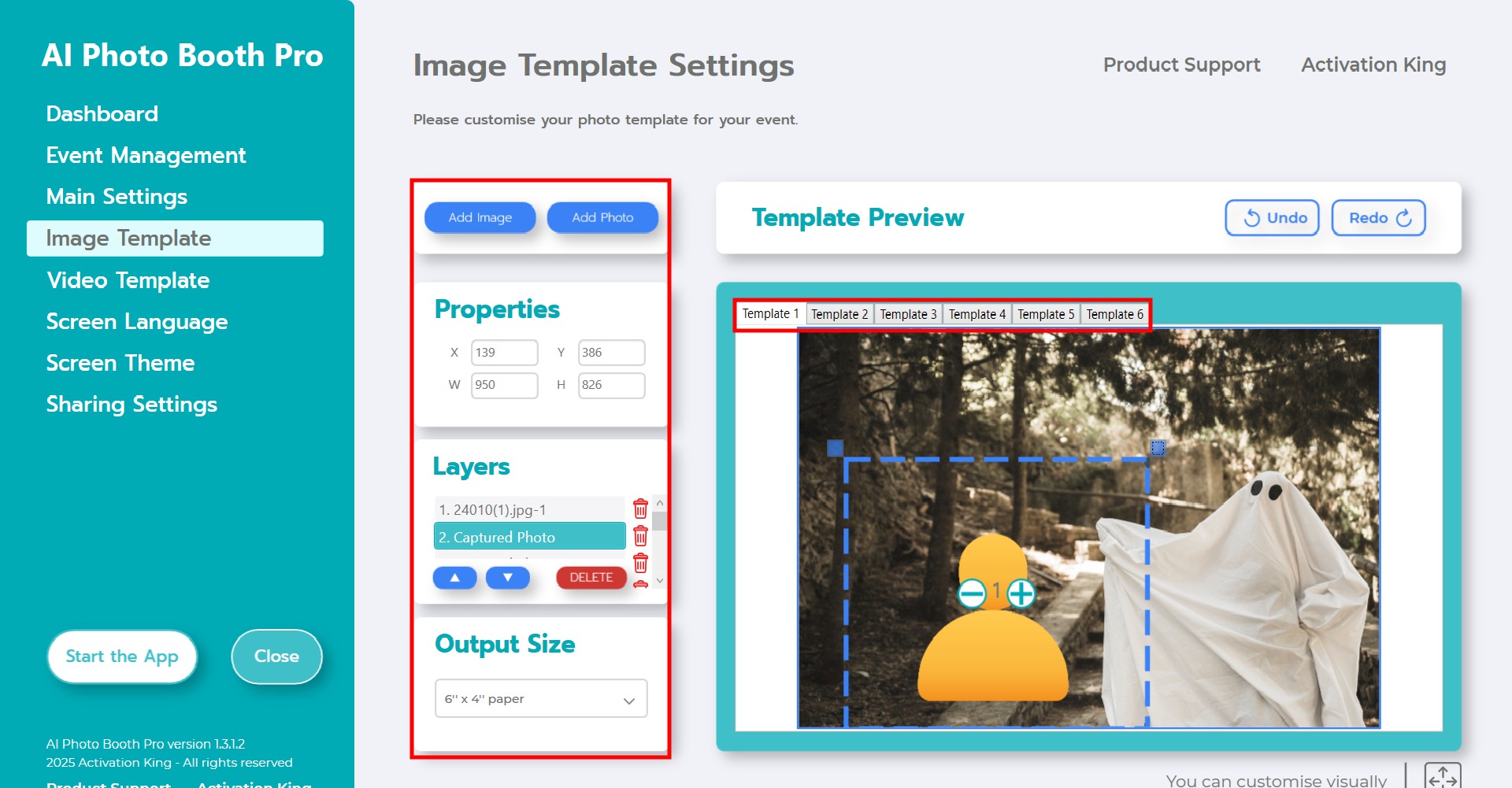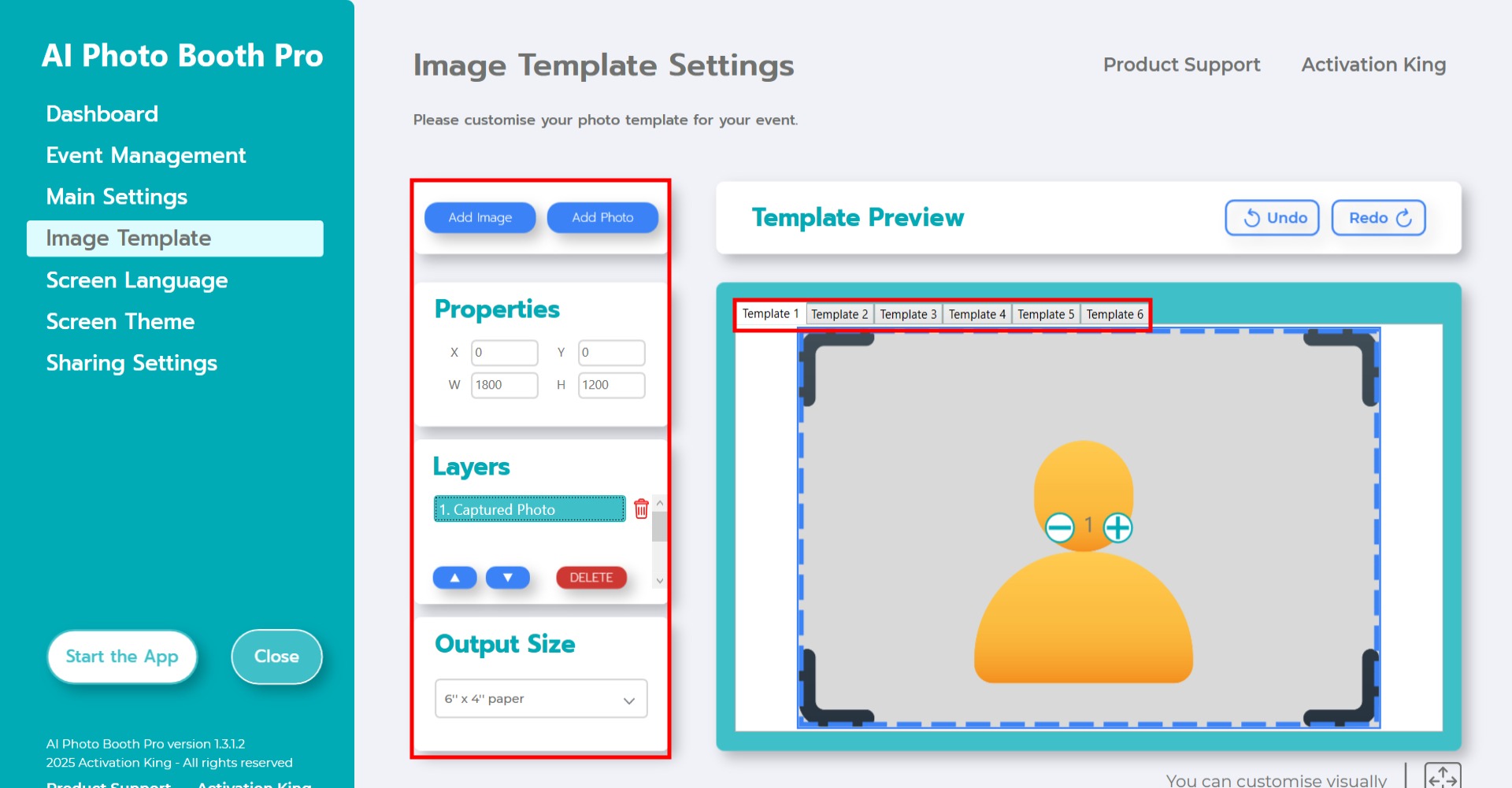 Next, in the Template Layers section, click on “Captured Photo.” You can adjust the position of the photo on the background manually in the template preview area or by entering exact values in the Image Properties section.