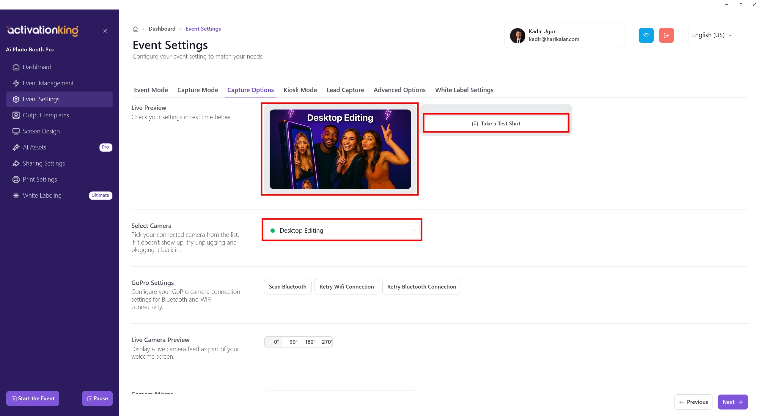 On this page, you can configure all your camera settings. If you select Desktop Editing from the Select Camera section, you can work with existing photos on your device without connecting a camera. You can also select a camera connected to your device from the same section. Once a camera is selected, your live image will appear in the Live Preview section. You can take test photos to check the lighting conditions and your current camera settings.