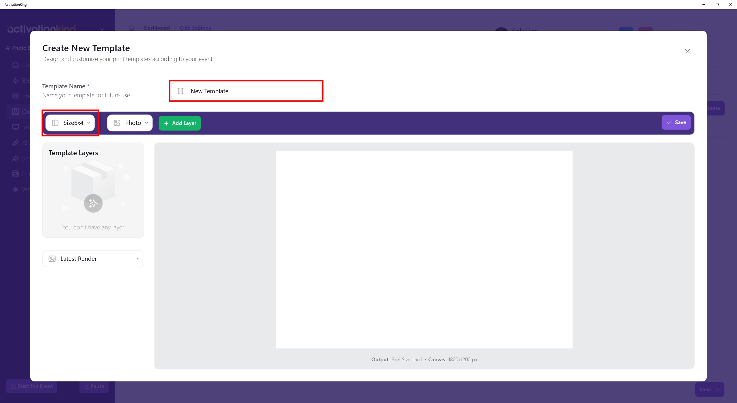 On the page that opens, you can name your templates if you plan to use more than one. If you will only use a single template, this is not necessary. I adjust the template size from the top-left section.