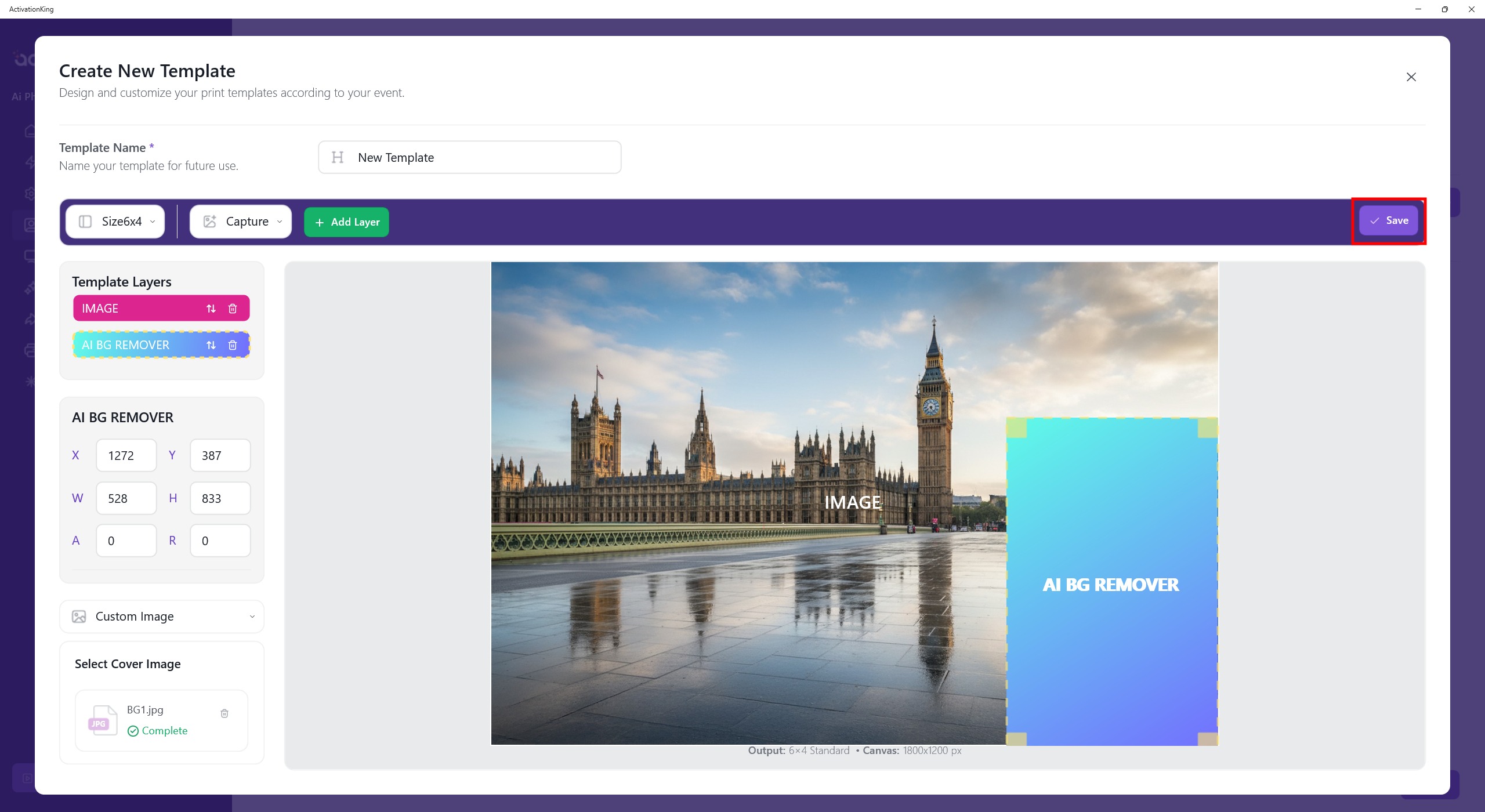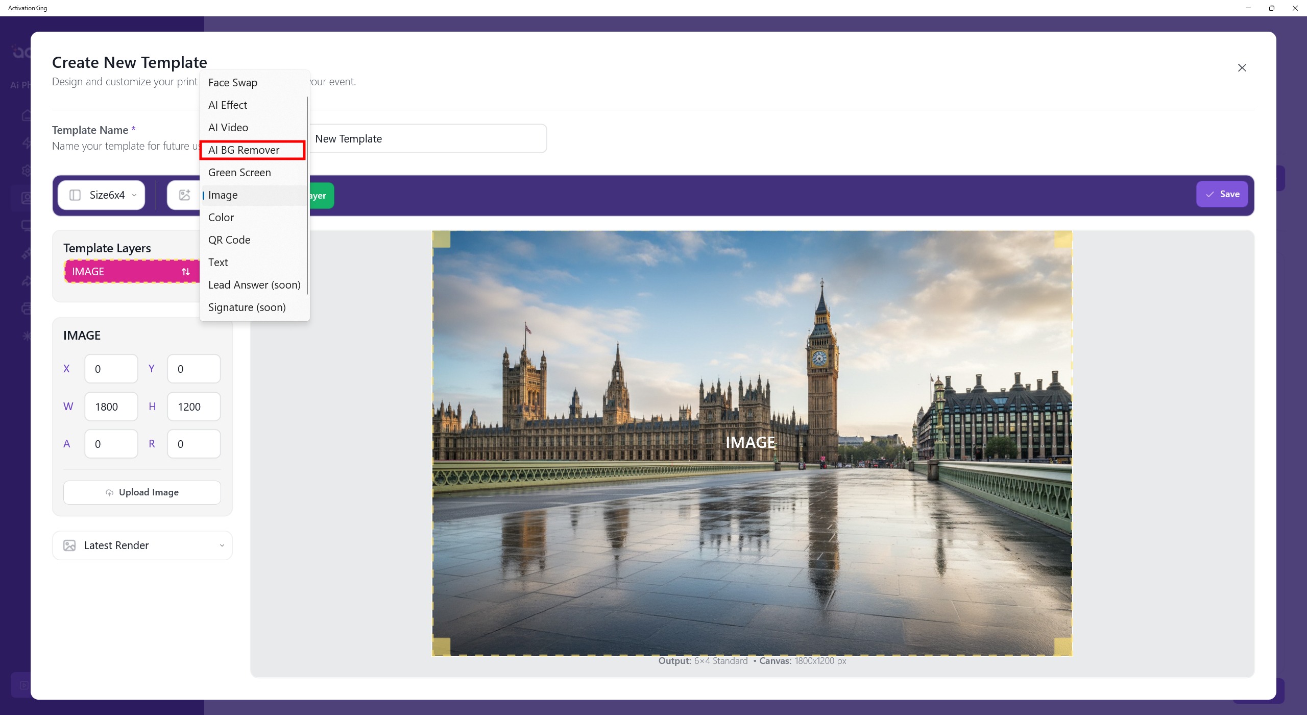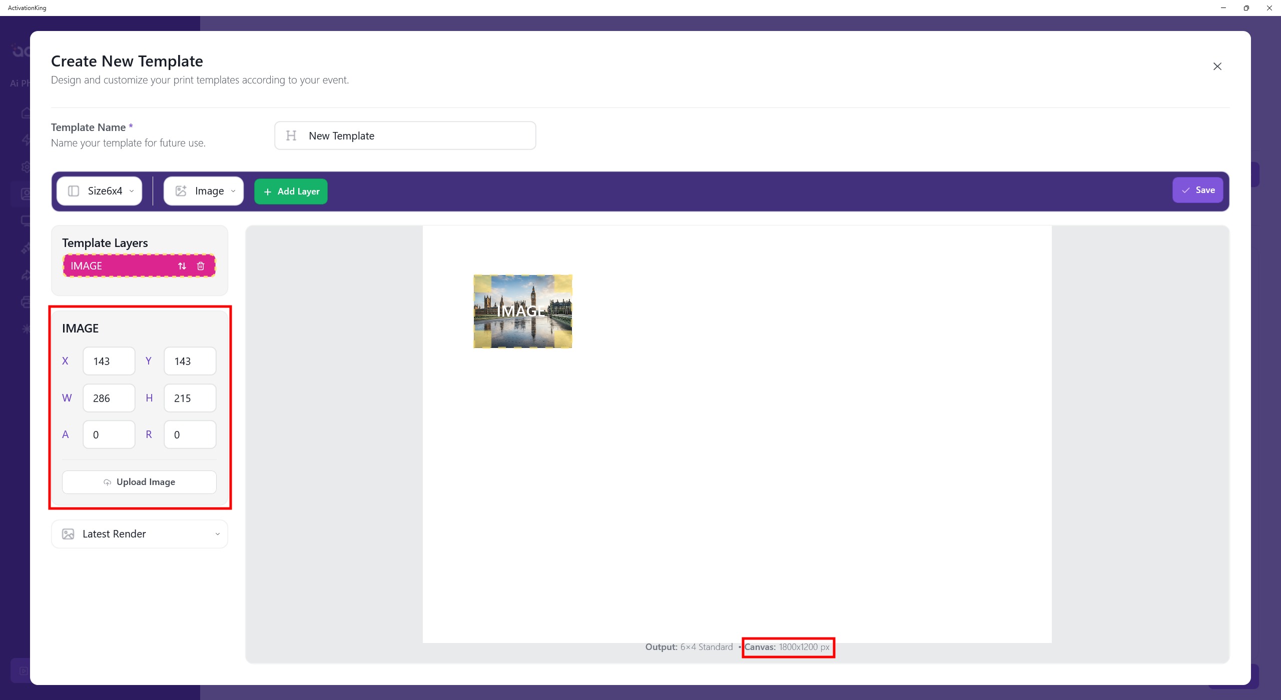 The template dimensions are shown at the bottom of the template. Therefore, I enter the dimensions as 1800 × 1200 from the left panel.