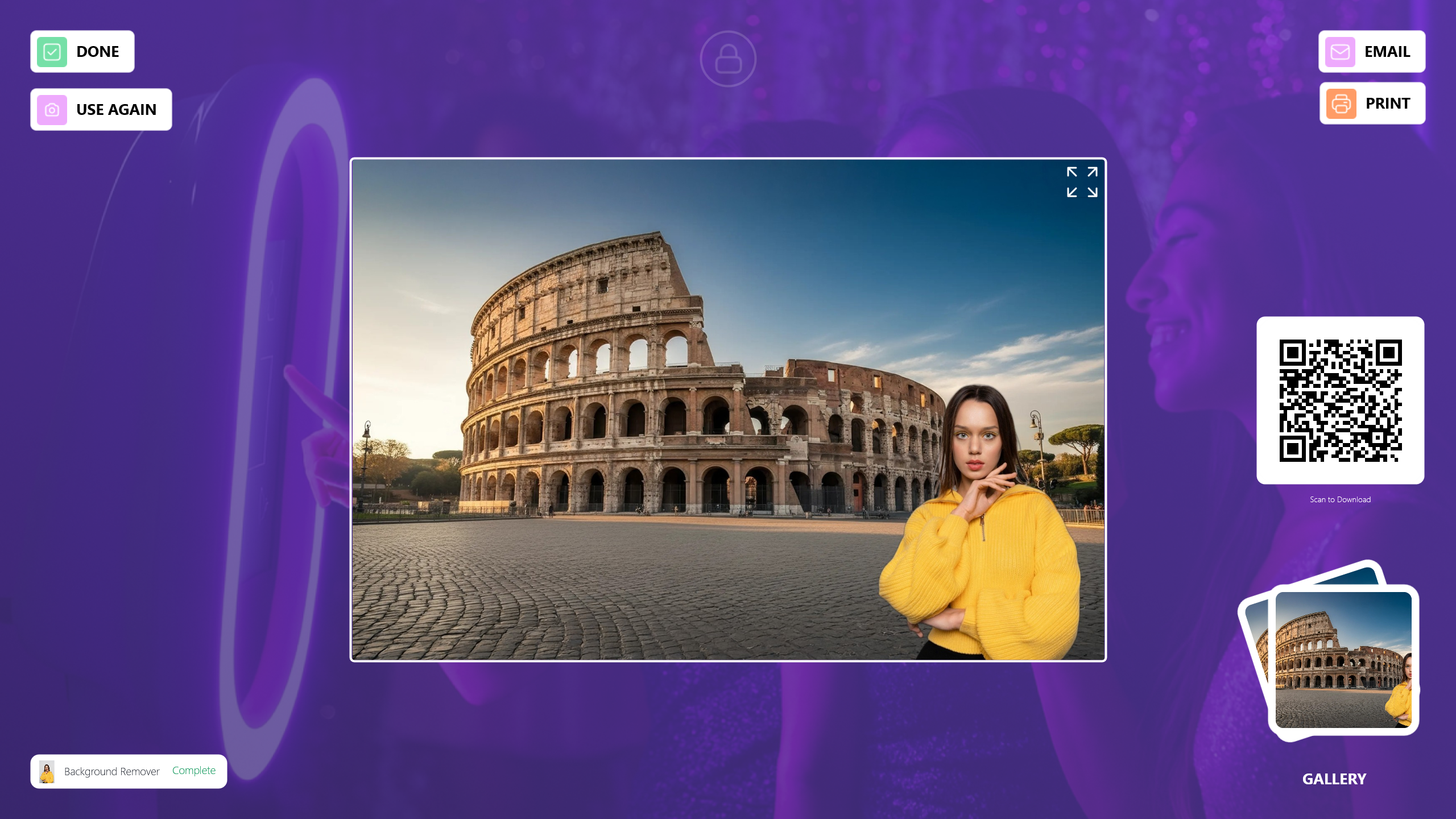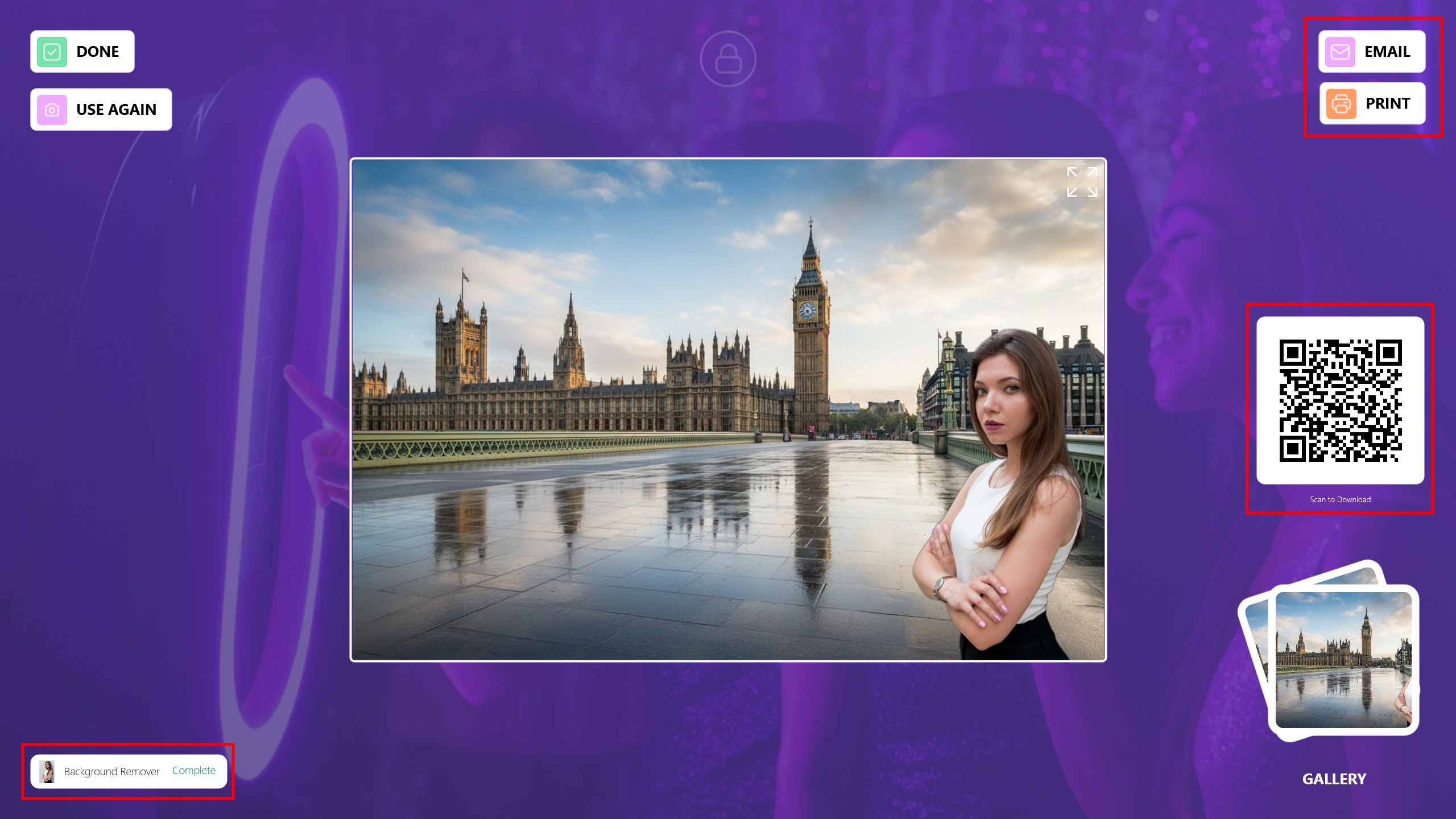 You can share the photo with your guests via Email, Print, or QR code.
