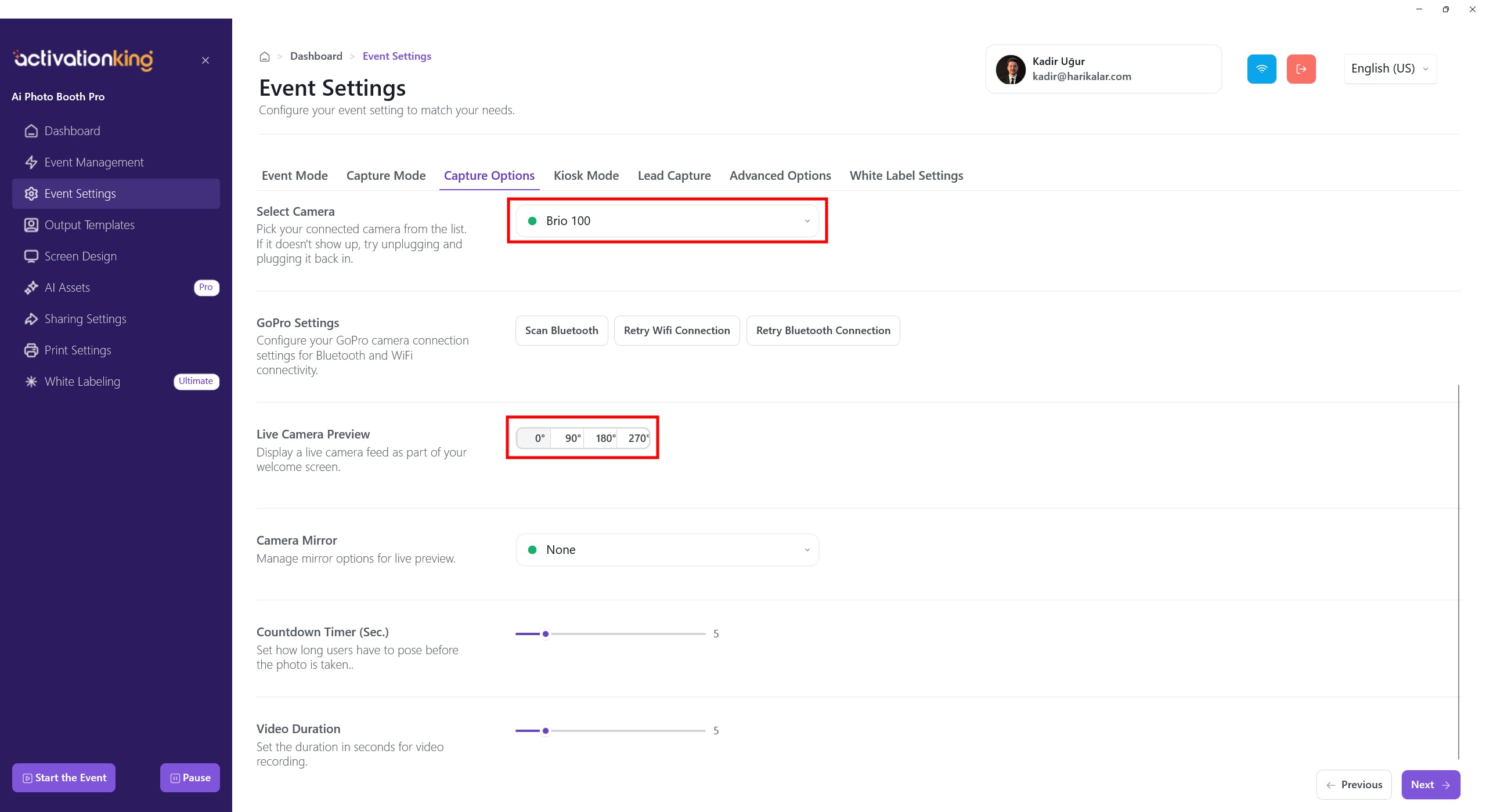 On this page, you can configure all your camera settings. If you select Desktop Editing from the Select Camera section, you can work with existing photos on your device without connecting a camera. You can also select a camera connected to your device from the same section. Once a camera is selected, your live image will appear in the Live Preview section. You can take test photos to check the lighting conditions and your current camera settings.